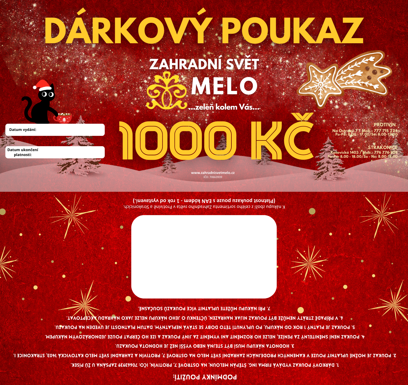 Poukaz je možné uplatnit pouze v kamenných prodejnách Zahradní svět MELO Na Ostrově 7, Protivín a Zahradní svět MELO Katovická 1403, Strakonice I.